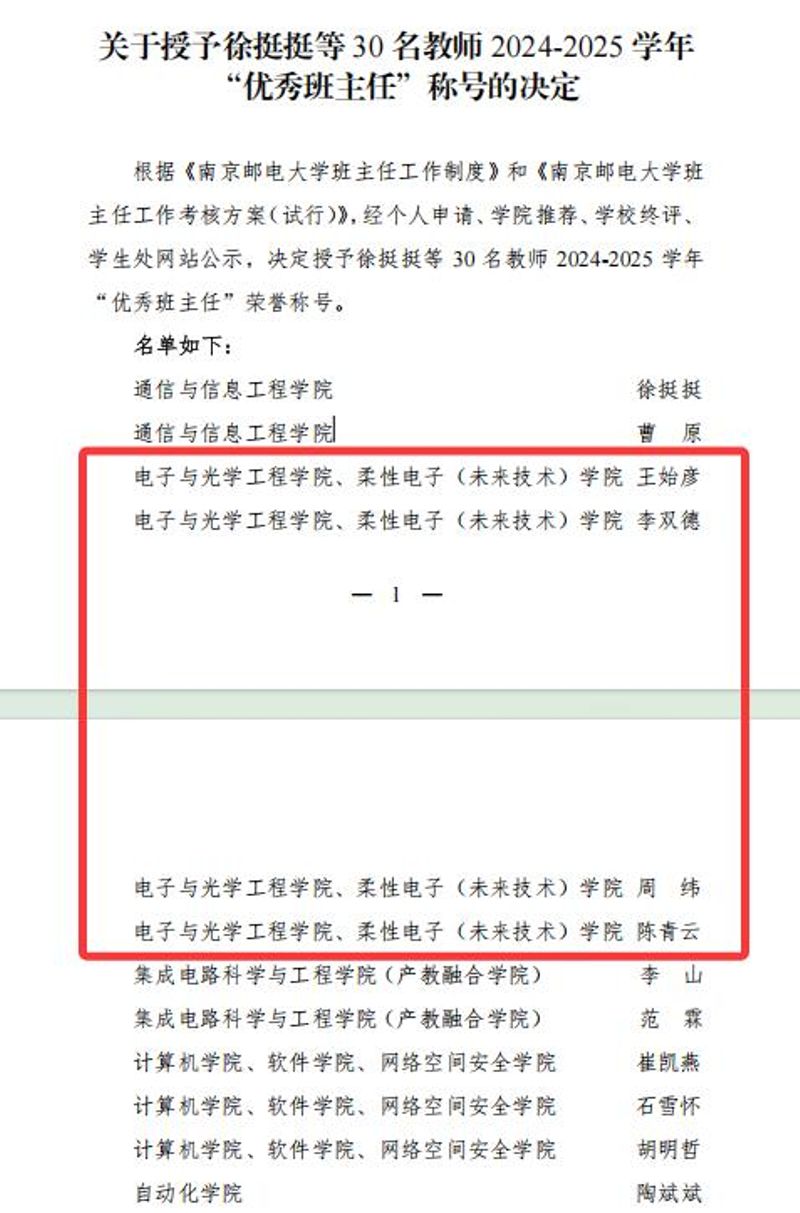 近日,做爱视频 2024-2025学年“优秀班主任”评选结果正式揭晓。全校共30位教师获此殊荣,其中,做爱视频 共有四位教师光荣入选,分别是王始彦、李双德、周纬、陈青云。本次评选注重学生的真实反馈,根据“学生评价情况”(即班主任工作测评分数)和班主任提交的各类履职材料,对各位班主任老师的履职情况进行综合评定,最终择优入选。做爱视频 此次能够有四位教师脱颖而出,荣获校级“优秀班主任”称号,是学校对学院班主任工作整体水平和育人实效的高度认可。入选老师在日常工作中,始终坚守育人初心,恪尽职守,在思想引领、学业指导、生涯规划、班级管理等方面倾注了大量心力,赢得了学生一致好评。此次优异成绩的取得是学院长期以来坚持立德树人根本任务、不断加强和改进班主任工作的成果体现。做爱视频 将以此为契机,持续深化班主任队伍建设,充分发挥优秀班主任的示范引领作用,不断探索学生工作的新思路、新方法,努力提升人才培养质量,为学生的全面成长成才和学校的高质量发展做出更大贡献。撰稿:祝腾审核:徐磊编辑:祝腾