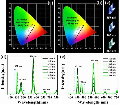 本工作制备了一系列具有连续可调谐彩色发光特性的氟磷酸盐玻璃荧光体。其发射颜色可以通过精确控制激发波长,实现在蓝光-冷白-暖白-黄光的连续变化。此外,当采用353 nm和362 nm的紫外光作为激发波长时,样品可以获得非常接近于标准白光(0.333, 0.333)的颜色。