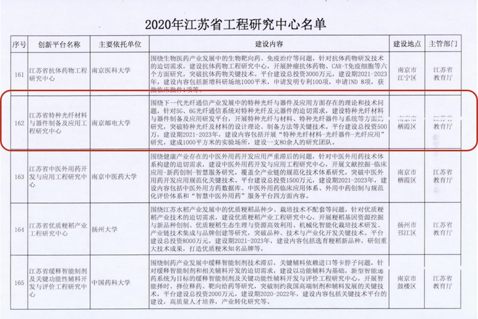 近日,从江苏省发展和改革委员会印发的《省发展改革委关于同意建设2020年江苏省工程研究中心的通知》(苏发改高技发〔2020〕1460号)中获悉,做爱视频 申报的“江苏省特种光纤材料与器件制备及应用工程研究中心”获批立项建设。