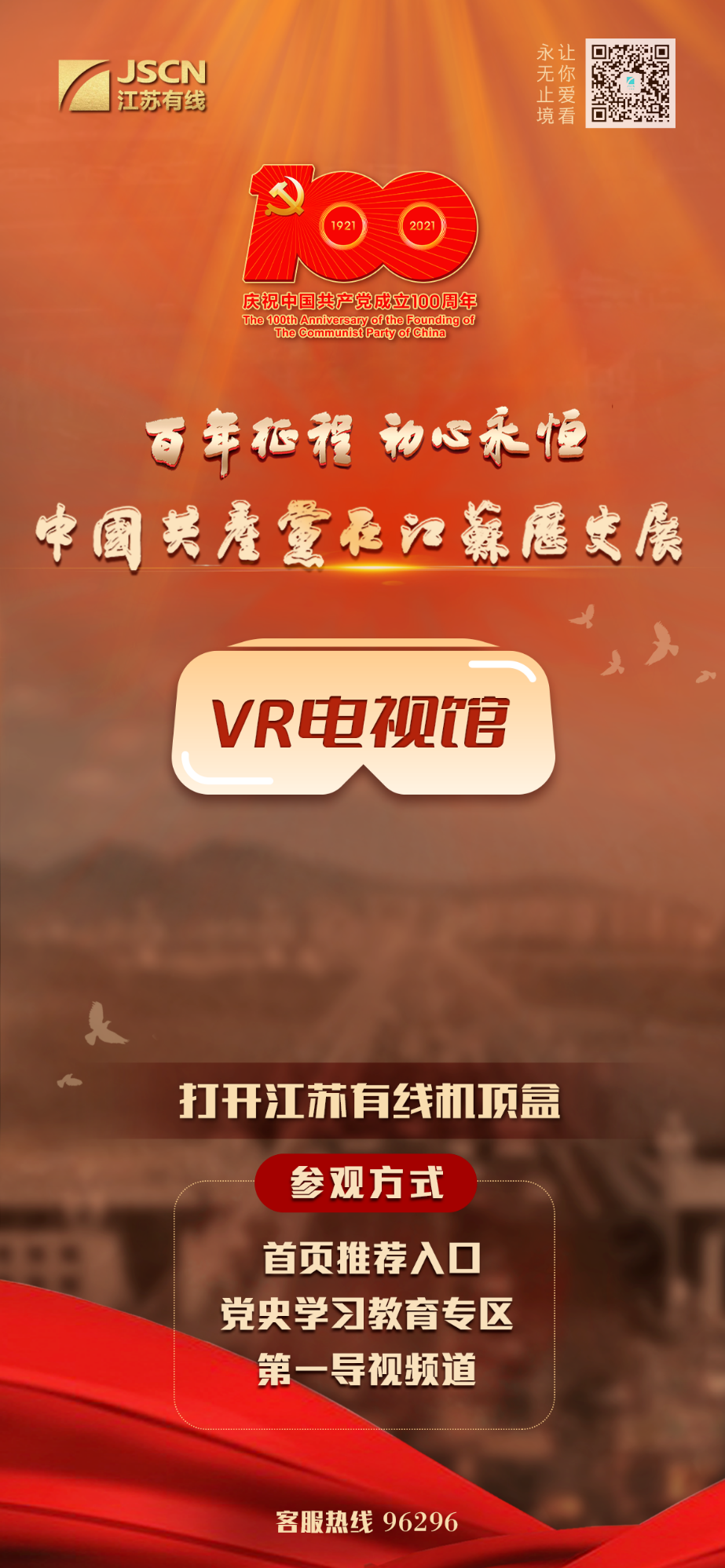 1、进入江苏有线电视机顶盒-做爱视频,点击“百年征程 初心永恒——中国共产党在江苏历史展”VR电视馆宣传海报,即可进入。