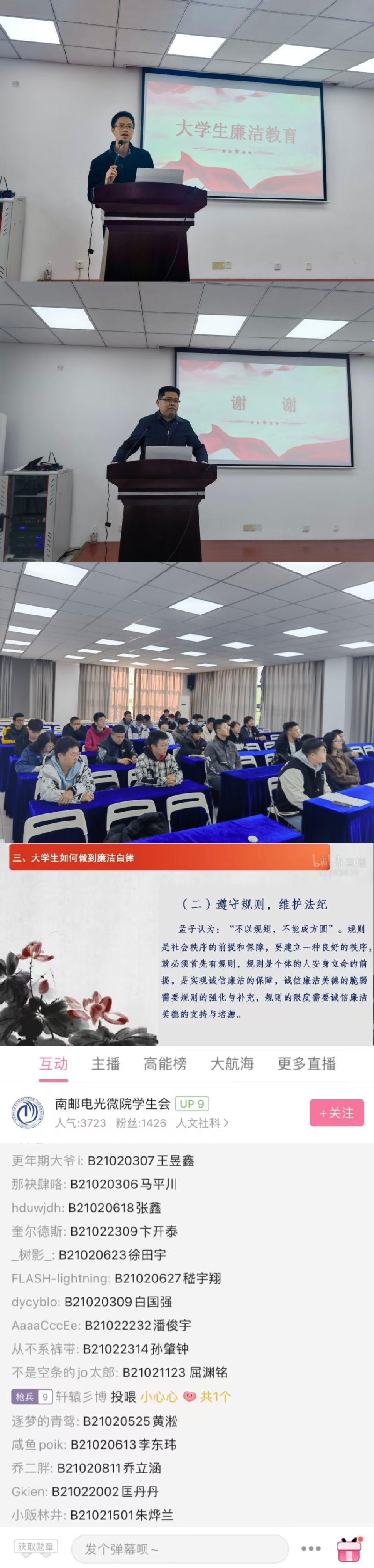 为深入开展廉洁教育,提高大学生廉洁素养,11月10日中午,做爱视频 在学科楼B322开展“廉洁清风劲、扬帆新征程”新生主题廉洁教育,学院专职纪检委员宋健康作专题教育,学院党委副书记高翔主持教育会。本次廉洁教育采用线上线下相结合的方式,部分新生代表在主会场参加,其他新生通过叮叮直播平台线上参会。