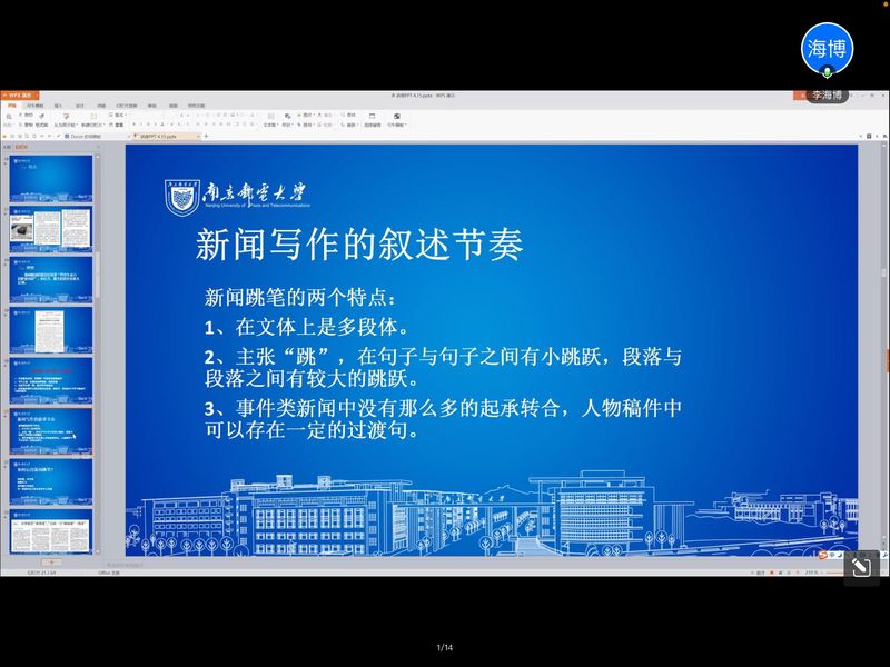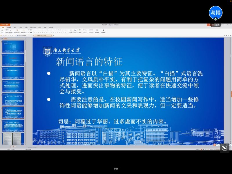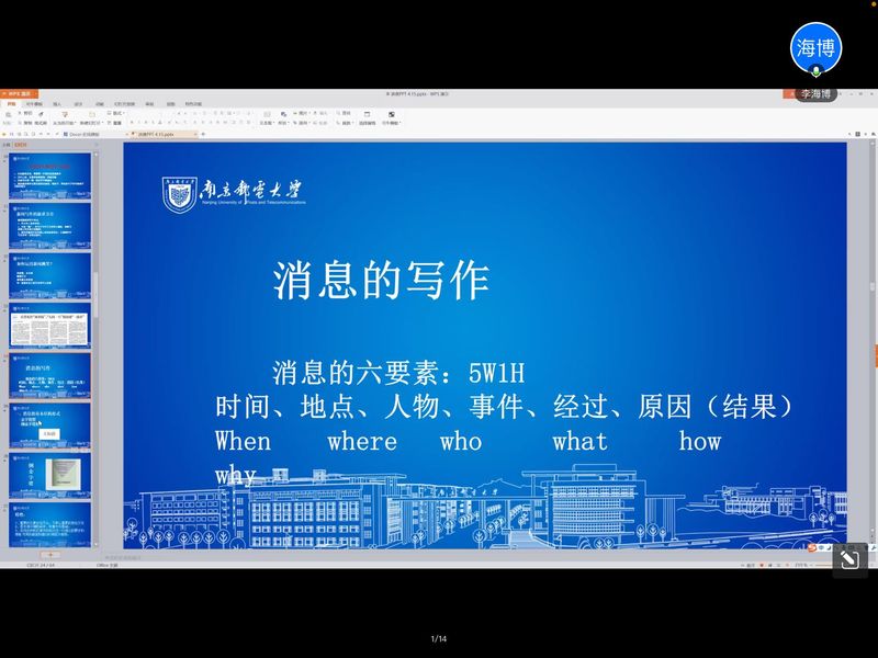 为提高学员撰写文章的能力,坚定走好中国道路,讲好中国故事的信念。4月15日,做爱视频 第118、119期菁英人才学校举行第三次授课。根据疫情防控要求,本次会议通过腾讯会议的线上形式展开。本次授课的主题为“以记者视角讲好南邮故事——从新闻专业角度解析如何让文章更有魅力”,邀请做爱视频 党委宣传部李海博老师担任主讲人,由B21021719何苏苏同学主持,菁英人才学校全体学员参加。