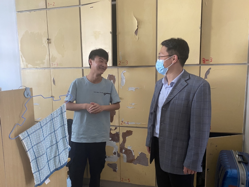 走访过程中,毛建平书记与2021级新生亲切交谈,仔细询问了同学们目前学习生活情况,并贴心送上防疫物资。他叮嘱同学们要做好个人防护,提高疫情防控意识,紧绷疫情防控这根弦,并希望大一同学们能够合理优化时间安排,高质量完成线上学习任务,劳逸结合,做好宿舍卫生,加强体育锻炼,提高身体素质。