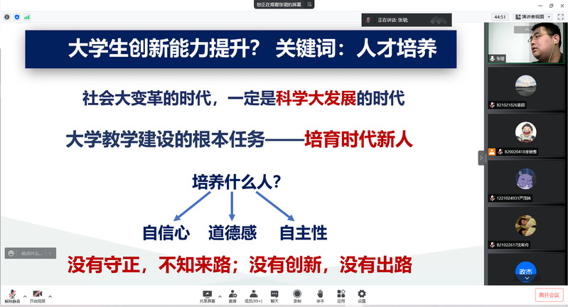 于5月19日举行第118、119期菁英人才学校第七次授课,由我校张珺老师担任主讲人。根据当前疫情防控要求,本次授课在线上展开。菁英人才学校全体学员参与本次授课。