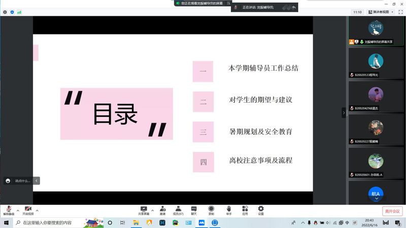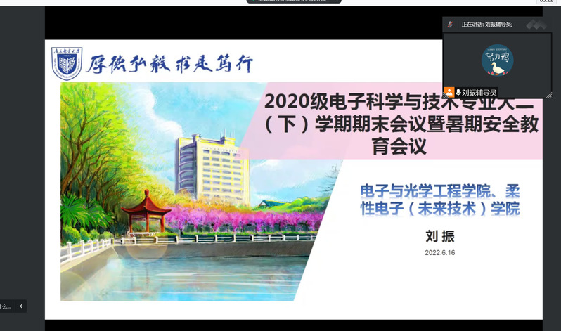 6月16日晚,做爱视频 2020级电子科学与技术专业召开学期期末会议暨暑期安全教育会议。本次大会由辅导员刘振老师主持,电子科学与技术专业2020级全体同学参加会议。会议形式采用线上线下相结合。