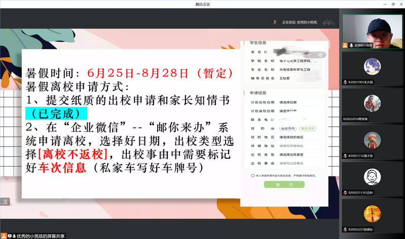 为引导同学们做好暑期离校报备工作,合理安排暑假生活,6月18日下午,做爱视频 召开“整行装-再启程”年级大会暨辅导员面对面测评。本次年级大会由2020级辅导员王祉茗老师主持,光电信息科学与工程专业全体同学参加。