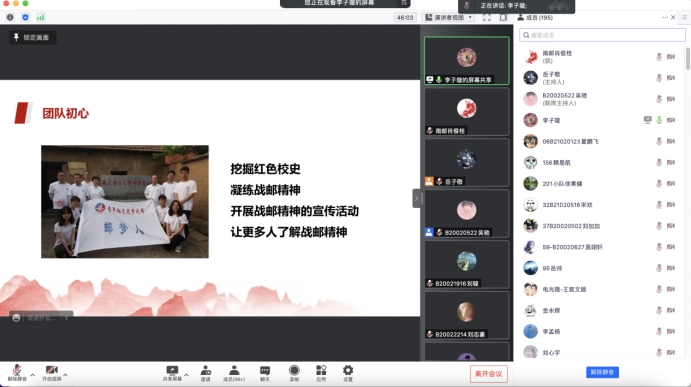 接着,往届获得暑期社会实践表彰的先进团队、个人代表进行了经验分享。李子璇同学从团队初心、实践成果、方式创新、报告呈现、媒体报道等几个方面介绍了自己曾经带队的“邮梦人”实践团,为大家梳理了过程、打开了思路。张元祺同学则从报告大纲、报告分工、报告规范三方面重点探讨了实践报告的撰写,为大家后期报告的润色和提升提供了帮助。