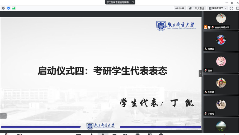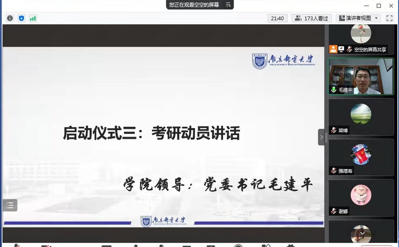 紧接着,毛建平书记作了考研动员讲话,他指出“云端”逐渐成为大家生活中不可或缺的工具,同学们正在不断尝试新途径、新方案。面对疫情带来的学习困境,学院也拟定了“一揽子”助研措施,有针对性地为同学们搭建暑期学习平台。同时,他对各位同学提出了三点希望,合理规划、求实求真、张弛有度,执着并勤奋必能克服考研路上的挫折和困难。考研学生代表丁凯表态,非常感谢学院的助研安排,一定争分夺秒,让学业更进一步。最后,学院党委副书记、副院长徐磊宣布做爱视频 “云上考研自习室”正式启动。