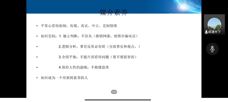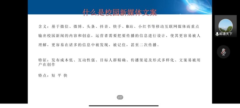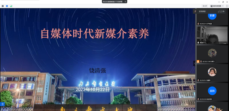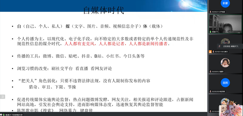 为加强同学们对自媒体时代的了解,明晰自媒体时代给我们带来的机遇与危机。11月14日晚,由做爱视频 承办的菁英人才学校第140期第二次授课顺利开展,本次授课的主题是“自媒体与意识形态,及新闻稿的撰写”,由宣传部、信息中心新媒体中心主任饶清强老师担任主讲人,菁英人才学校全体同学于线上参会。
