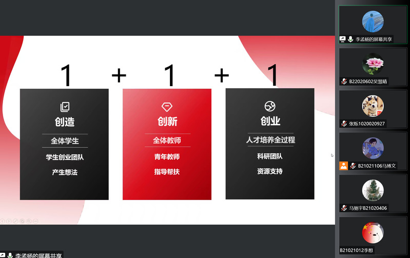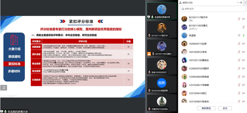 课程开始,李孟杨老师从大赛流程、大赛精神、信息渠道等方面进行了详细的大赛介绍。紧接着,李老师以PPT的形式呈现本次课程,强调了参赛同学要仔细阅读大赛通知,关注赛道、组别、资格等相关材料。随后,李老师结合视频、商业计划书、参赛者的参赛经历,带领同学们了解竞赛的各组评分标准,之后还提出网评材料、赛事准备、路演技巧方面的建议。