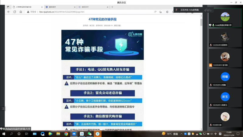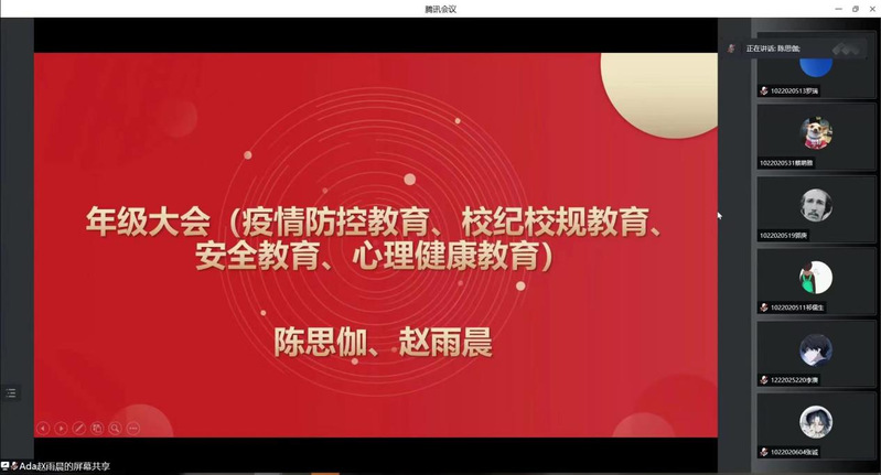 会上,陈思伽老师从防疫政策的解读与解答、校纪校规的处分规定等方面进行讲解,分别就“疫情防控二十条措施”、“动态清零的科学内涵”、“学校防疫政策”和“要坚持佩戴口罩的重要性”进行了详细的解读。随后,陈老师阐述了遵守校规校纪的重要意义,强调学习和遵守校规校纪的重要性,树立正确的思想道德观念及道德行为准则意识,要在牢记校规校纪的同时,切实提高个人素质,养成良好的学习和生活习惯。