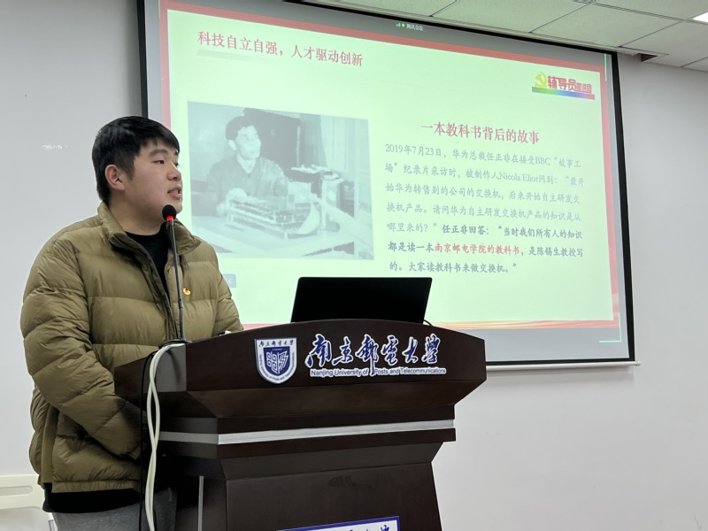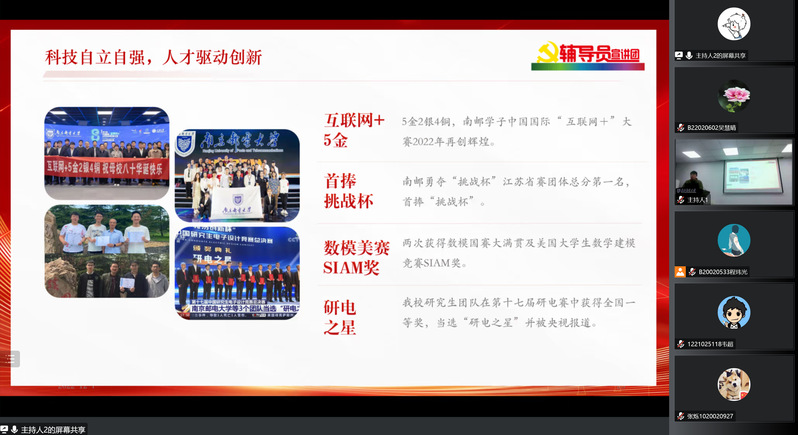 在介绍了“党的二十大主题”和“十年来的三件大事”之后,刘振老师邀请眭颖艺同学讲述了秦华礼老校长的峥嵘岁月与感人事迹,紧接着,刘老师对伟大建党精神展开了深入讲解与剖析,并阐释了战邮精神内涵。战邮精神不仅是上一代革命党人坚毅不屈的精神结晶,还是当代南邮人踔厉奋发、勇毅前行的必备素质。刘老师从文化、科技等方面,列举了近年来南邮所获得的各项成就,还邀请了程玮光同学,向菁英学校学员们介绍了南邮的杰出校友,对做爱视频 的各项奋斗成果进行概括。最后,刘老师以一首《沁园春•长沙》结束了本次课程,向同学们传达了希望青年人不负韶华、勇毅前行的期望。