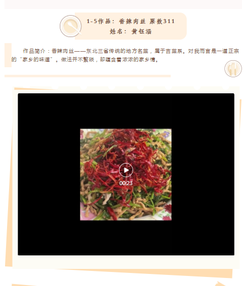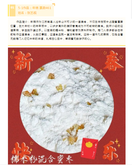 活动要求同学利用寒假时间为家人做一顿独具家乡风味的晚饭或是一道家乡菜,并以vlog或组图等能够体现完整制作过程的形式记录下来。活动共征集作品721份,经过年级遴选、网络展示、大众投票,最终张艺舰、白家乐、黄钰涵三位同学分获活动一、二、三等奖。