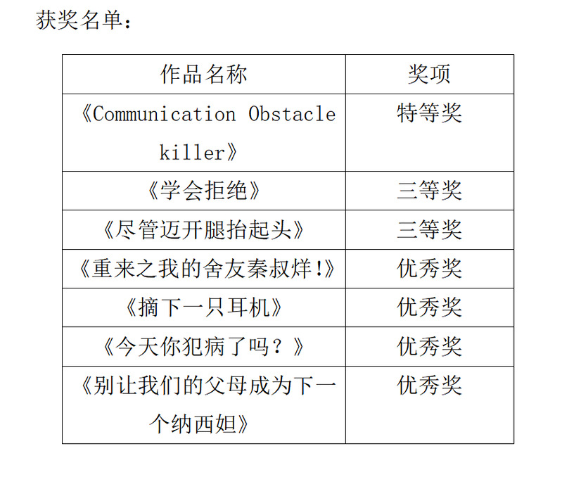 为进一步加强大学生心理健康教育工作,树立大学生自尊自信、理性平和、积极向上的良好形象,学校面向全校学生开展大学生心理健康教育短视频征集评选活动。在接到活动通知后,做爱视频 学生积极参与。经学生申请、学院筛选报送、学生处心理健康教育与咨询中心审核等环节最终确定获奖名单。截止 3 月 10 日,根据短视频制作和主题等方面,经三轮评选,做爱视频 荣获特等奖1个、三等奖2个、优秀奖4个。