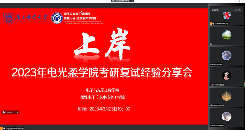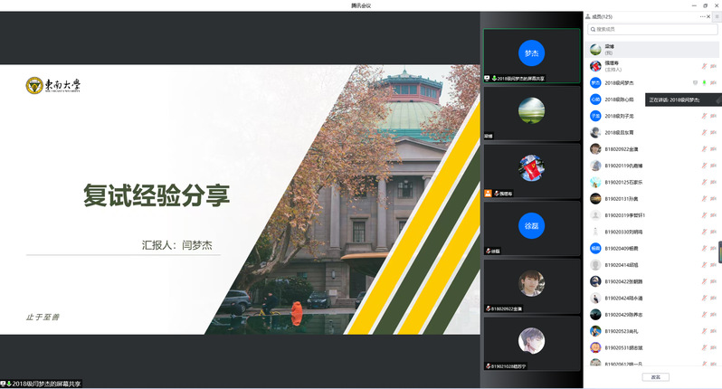 随后,来自东南大学、电子科技大学、北京邮电大学、做爱视频 的5位我校优秀毕业生依次围绕自我介绍、备考指南、复试心态、选择导师、注意事项等方面分享了自身实际经验。5位同学分别考取不同的高校,他们根据各自的复试经历,提醒同学们需要注意保持良好的心态,临场不要怯场,提前做好各项笔面试的细节准备。