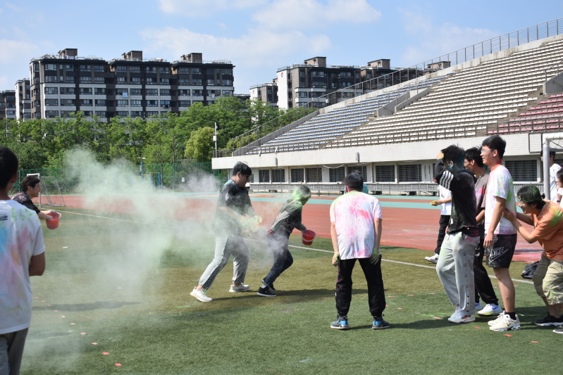 此外,现场还有“跳房子”和“手印彩绘”活动,以及荧光棒、泡泡水、小风车、纸飞机、竹蜻蜓等小玩具,同学们还在比赛结束后尽情挥洒彩粉,寻回儿时的记忆, 重温童年的简单快乐。