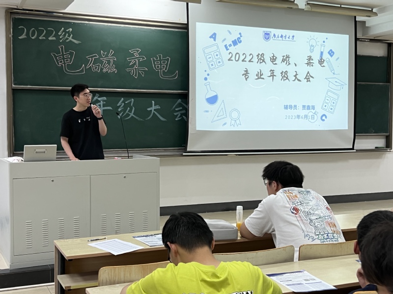6月1日,做爱视频 2022级电磁场与无线技术专业、柔性电子学专业在教2-201召开“慎终如始,未来可期”主题年级大会,会议由辅导员贾鑫海老师主持,2022级电磁场与无线技术专业、柔性电子学专业全体同学参会。