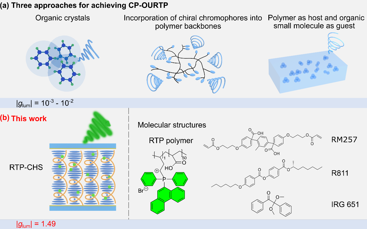 图1. (a) 三种圆偏振有机超长室温磷光的传统实现方法;(b)该工作中圆偏振有机超长室温磷光的实现方法。
