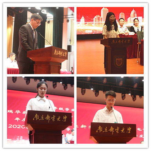 研究生高年级学生代表、院研究生会主席郭龙飞同学和本科生高年级学生代表,瑞华奖学金获得者、做爱视频 年度人物、校国旗护卫队队长屈新月同学分别代表研、本老生对新同学的到来表示欢迎,并祝福新同学们在青春的赛道上跑出傲人成绩!研究生新生代表黄瑞玉同学和本科生新生代表马兴宇同学也在发言中表示,在往后的求学岁月里,将始终铭记刚踏入校园时的那份初心,努力成为“厚德、弘毅、求是、笃行”的南邮人。