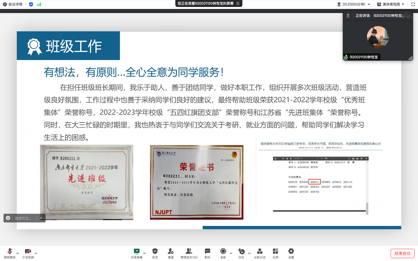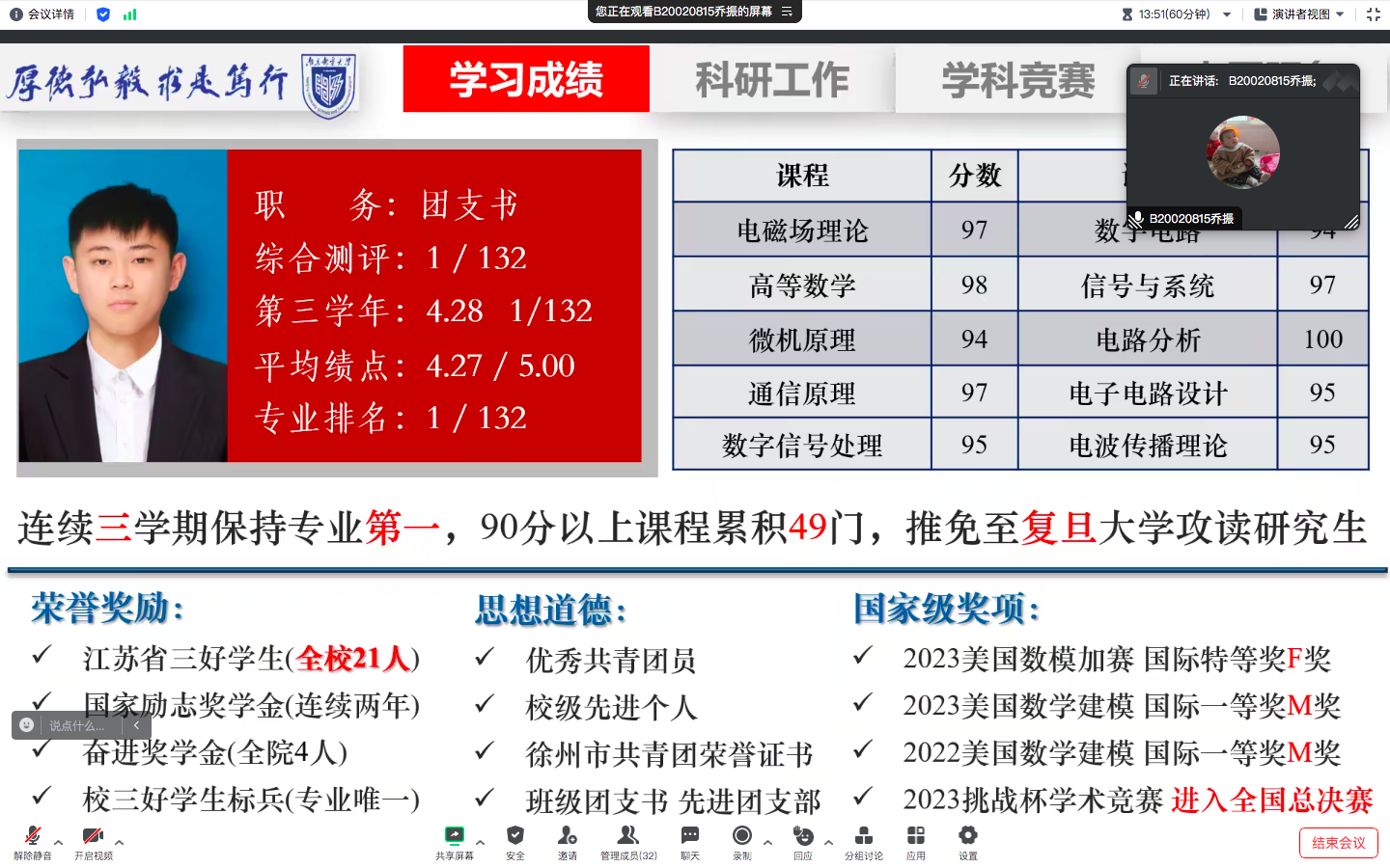 为树立典型,表彰先进,引导学生成为品德高尚、富有理想、快乐健康、积极向上、全面发展的新时代大学生,10月5日上午,做爱视频 2020级电磁场与无线技术专业于线上开展了2022-2023学年“三好学生标兵” “三好学生”“优秀学生干部”公开答辩展示会,会议由辅导员肖俊桂老师主持。