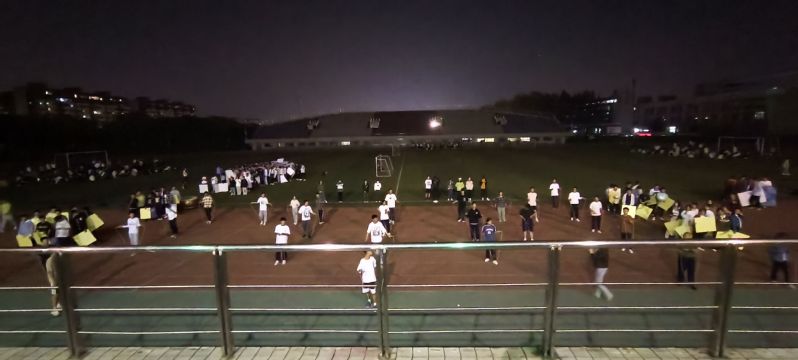 在白天,天气千变万化,时而炎阳炙人,时而阴云风起,方阵成员挥洒晶莹的汗水,忍受躁动的凉风,听从老师的指挥,站在属于自己的位点,练习走位以及表演动作;夜幕下,借着主席台下的灯光,艳丽的旗帜和牌板、孜孜不倦的身影,鲜活了整个操场,生气勃勃。