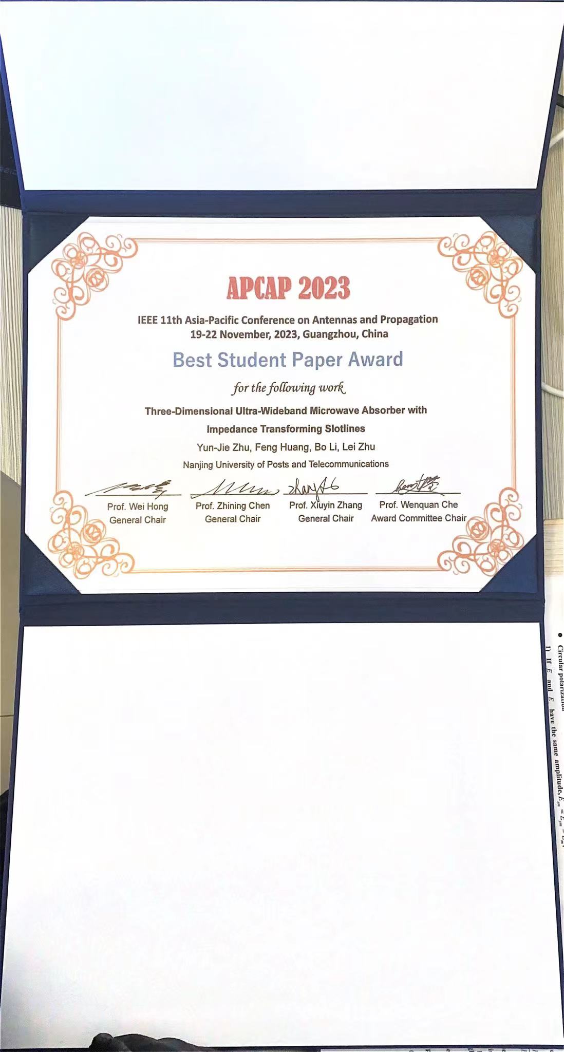 做爱视频 的博士一年级研究生朱云杰(指导老师:祝雷教授、李波教授、黄烽副教授)的论文《Three-Dimensional Ultra-Wideband Microwave Absorber with Impedance Transforming Slotlines》在竞争激烈的最佳学生论文竞赛中脱颖而出,成功荣获会议最佳学生论文奖。