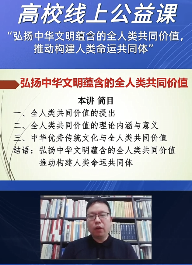 为帮助同学们学习了解人类命运共同体的时代意义及深刻内涵,领悟认同中华文化对全人类的共同价值。近日,做爱视频 第169期菁英人才班第二次授课通过高校线上公益课的方式举行,课程主题为——弘扬中华文明中蕴含的全人类共同价值,推动构建人类命运共同体,由中央社会主义学院中华文化教研部副主任翁贺凯教授主讲。