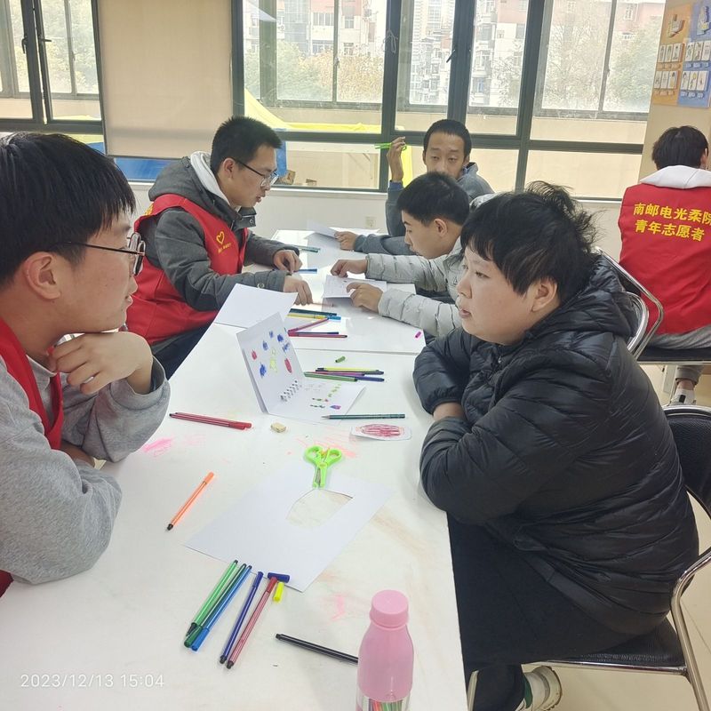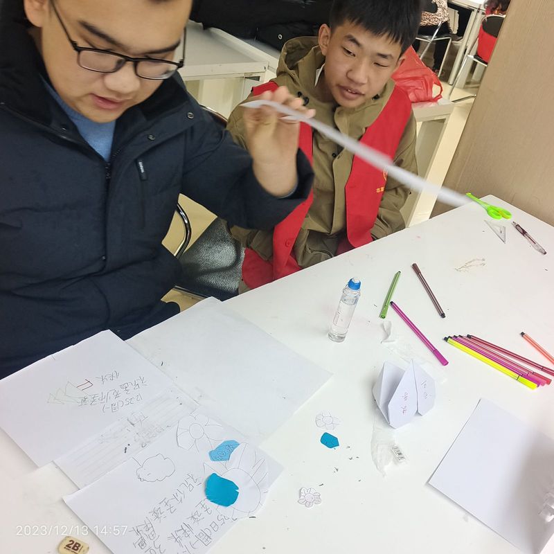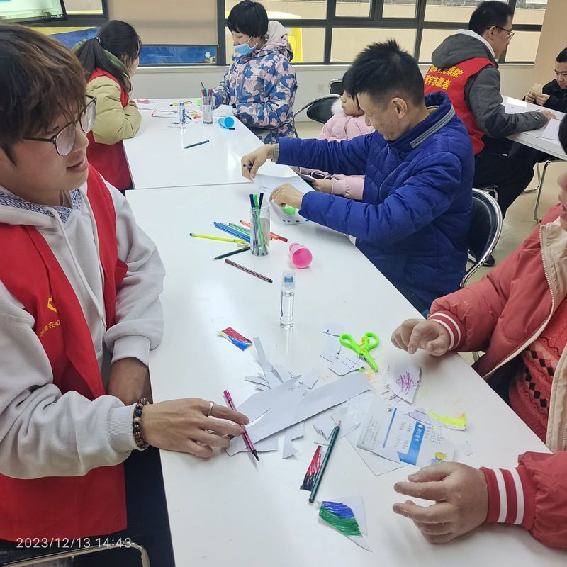活动伊始,志愿者们在学员的长桌前就坐,主持人就本次活动的主要内容做了简单概述。随后,活动正式开始,第一项“自我介绍”,何学员积极上台,介绍自己的个人信息等,接着又有几位学员上台介绍。紧接着第二项“自由创作”,首先通过观看视频学习如何制作精美的元旦贺卡,然后学员就开始自由创作。学员在志愿者的提示下将纸对折,在折痕的一边拿起铅笔画起了小房子、太阳、云朵、草地等,后又在指导下用彩笔给图画上色,一幅简易的图画就完成了。第三项活动是“主题创作”。针对元旦这一主题,主持人展示了一些可联想的事物,如灯笼、冰糖葫芦、扫尘等,接着学员就开始了的自由绘画。学员在志愿者的指引下在图纸上画起了有握把、有流苏的大灯笼,学员在志愿者的帮助下用剪刀剪下了“2024”的数字,并用胶水将它们粘在了图纸上,彰显年份信息。其他学员也是在志愿者的引领下积极主动地参与了创作。