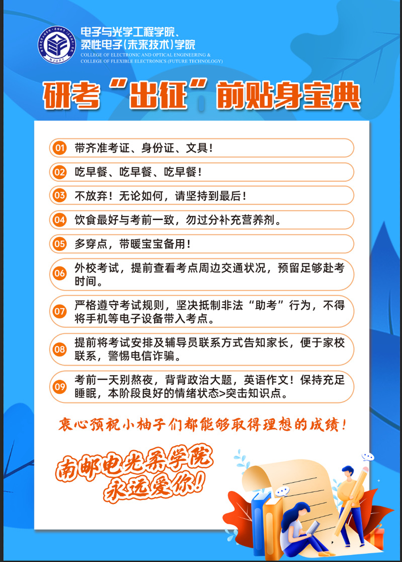 同时,为了更好地帮助同学们,学院还精心准备了研考“出征”前贴身“宝典”,并在每个学生的宿舍内进行了张贴。提醒单上详细列出了考研期间需要注意的事项和备考建议,包括考场规则、答题技巧、饮食休息、防诈骗等方面的内容,为同学们提供了全面且实效的指导和帮助。