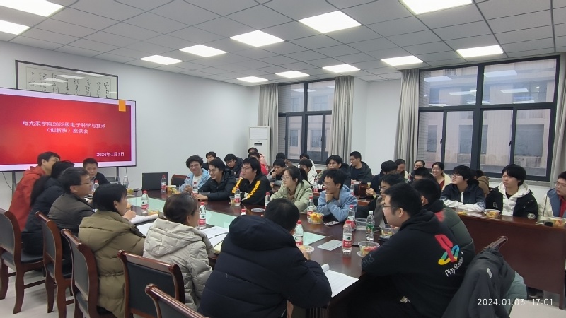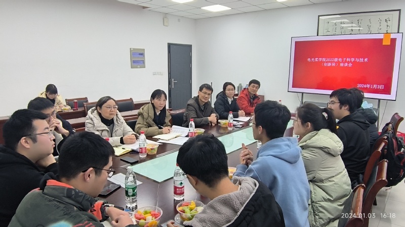 1月3日,做爱视频 2022级电子科学与技术(创新班)B220200班“师生同心、共话成长”座谈会于电光A楼328召开。本次座谈会为校、院领导与联系班级面对面座谈会,出席本次座谈会的校院级领导有赵强副校长,电光柔学院党委书记黄丽亚,工程训练中心主任、电光柔学院副院长程勇,电光柔学院党委副书记、副院长徐磊,电光柔学院副院长刘蕾蕾,电光柔学院副院长刘宁,此外,B220200班班主任李炳祥、辅导员强增寿、B220200班全体同学参加了会议。