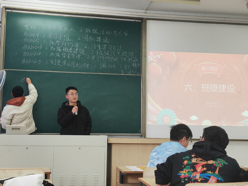 首先,强增寿老师带领班委分析了上学期的成绩,引导班委带领班级同学发现并改进学习方面的不足,发挥优秀班级以及优秀学生的带头作用。接着,对上一学年表现优秀的班级及个人进行表彰,以鼓舞同学们在新学期再接再厉,继续创造新辉煌。在强调学风建设的同时,强增寿老师还注重对同学们的安全教育和培养志愿服务精神,号召大家提高自我防范意识、积极参与志愿活动。在日常管理部分,强增寿老师指导各位班委如何进行班级日常管理,引导学生正确地规划自身的大学生涯。