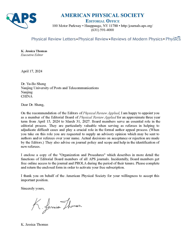 近日,由美国物理学会(APS)旗下期刊《Physical Review Applied》主编Eager教授和多位副主编面试并推荐,美国物理学会出版社执行主编Jessica Thomas博士发来正式邀请函。邀请做爱视频 盛宇波教授担任《Physical Review Applied》期刊编委 (Editorial Board Member),主要负责量子光学、量子信息等方向的稿件处理。