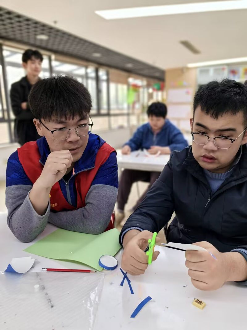 活动伊始,青年志愿者们与睿泽学员们一起进行了简单的自我介绍,借此拉近彼此间距离,为共同合作做好准备。在“纸杯花朵制作活动”环节中,志愿者带领学员们熟悉了如何利用纸杯和画笔创作出表情、颜色各具特色的纸杯花朵。用象征春色正好、阳光暖人的花朵表达了对未来人生的憧憬与祝福。随后是“春色满园山水画”制作环节,同学们用画笔沿着手掌轮廓在画纸上画出一座座青山,同时加以柳树云朵、山花烂漫点缀,描绘出怡人的春日景象,每一个都栩栩如生,他们的眼神中充满了对生活的热爱和对未来的憧憬。当大家的作品都陆续制作完成后,学员们彼此交流、欣赏对方的作品,共同感受艺术的美妙。活动结束后,学员们共同清理了工作区,将桌面、地面恢复整洁。