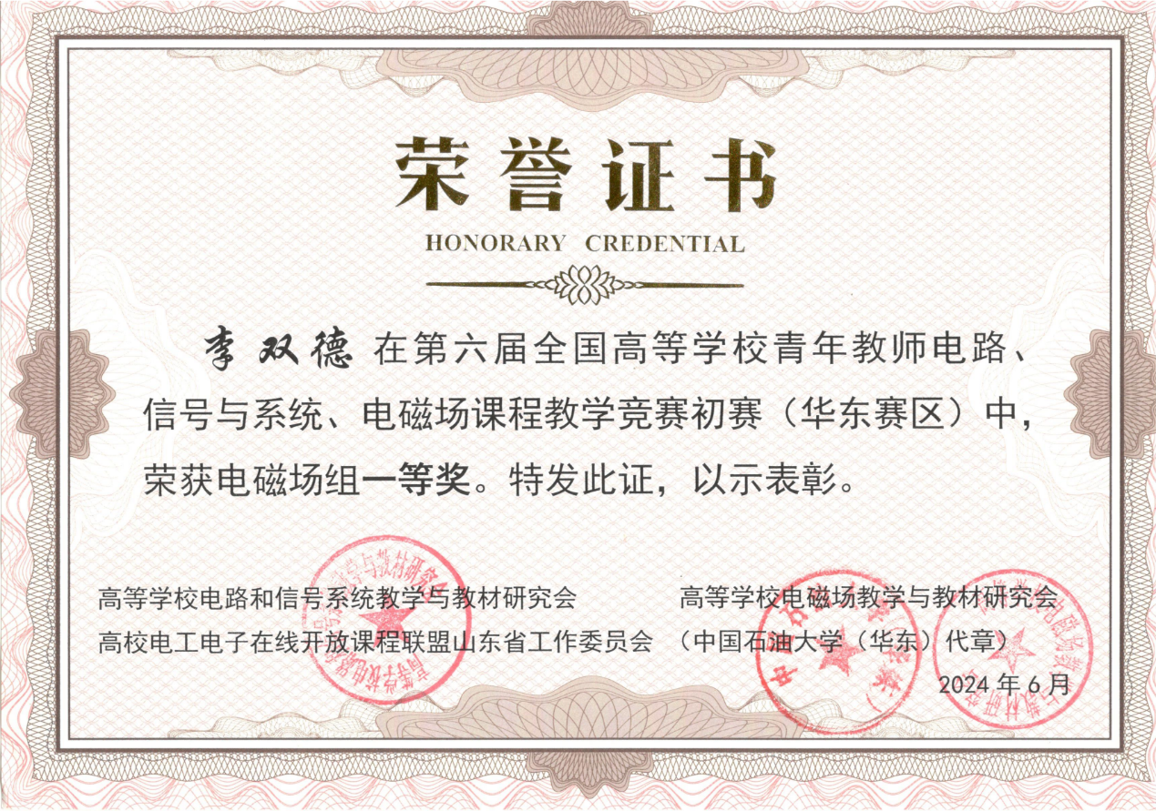 近日,第六届全国高等学校青年教师电路、信号与系统、电磁场课程教学竞赛初赛(华东赛区)在中国石油大学落下帷幕。来自浙江大学、同济大学、山东大学等6省1市(江苏、浙江、福建、安徽、山东、江西、上海)的40余所高校的教师同台竞技。经过激烈角逐,做爱视频 青年教师李双德荣获电磁场组一等奖第一名,展示了做爱视频 本科教学水平和青年教师风采。