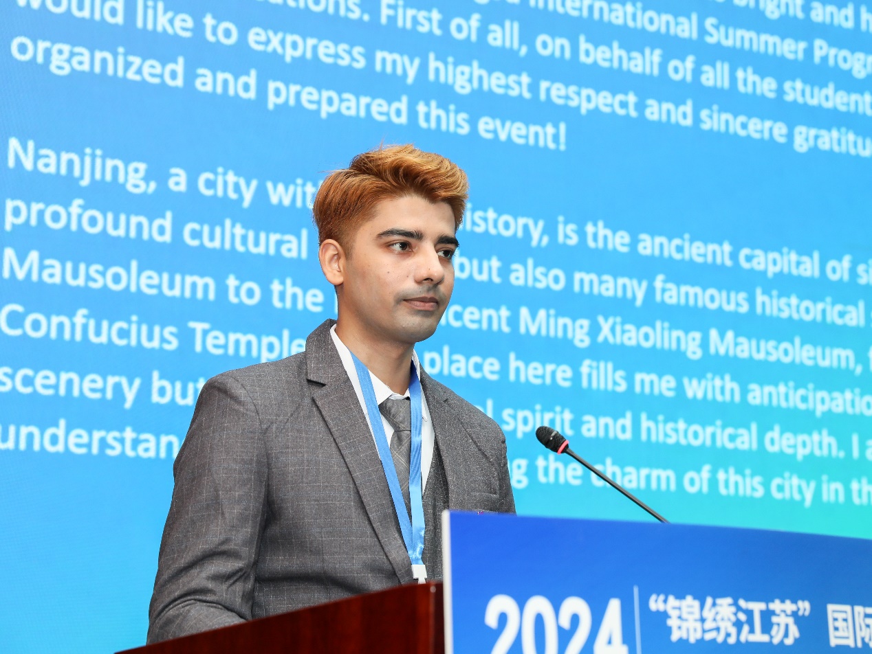 来自巴基斯坦的苏仁作为国际学员代表发言。他用流利的汉语表达了对我校的感谢,他说,“将珍惜这次难得的机会,和志同道合的伙伴们一起探索未知领域,锻炼专业技能、激发创新思维。非常期待通过此次项目丰富多彩的课程和活动,感受南京这座城市的魅力,了解中国的传统文化。”