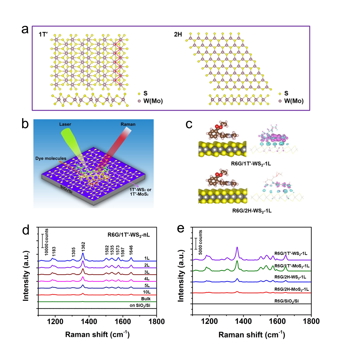 二维过渡金属二硫化物(TMDs)具有独特的物理化学性质,如良好的原子均匀性、化学稳定性和生物相容性等,其作为新一代SERS基底研究吸引了广泛的关注。但传统的半导体相TMDs由于电荷转移速率低,极大地影响其在SERS方面的应用。针对这一难题,该工作利用纳米材料相工程(PEN)技术对二维过渡金属二硫化物WS2和MoS2的结晶相进行调控,制备具有高纯度扭曲八面体相的WS2和MoS2(1T′-WS2和1T′-MoS2),并研究了半导体相(2H)与半金属相(1T′)对其SERS性能的影响。与2H-WS2和2H-MoS2相比较,单层的1T′-WS2和1T′-MoS2展现了更加优异的SERS性能,对分析物R6G分子的检出限分别达到8.28 ×10–12M和8.57 ×10–11 M, 拉曼增强因子分别为4.6×108和3.9×107。第一性原理密度泛函理论证明,单层的1T′-WS2和1T′-MoS2的SERS效应主要归因于其与分析物之间高效的光诱导电荷转移。该工作展示的相依赖SERS特性使得通过PEN策略设计和制备新型TMDs基SERS基底成为可能。