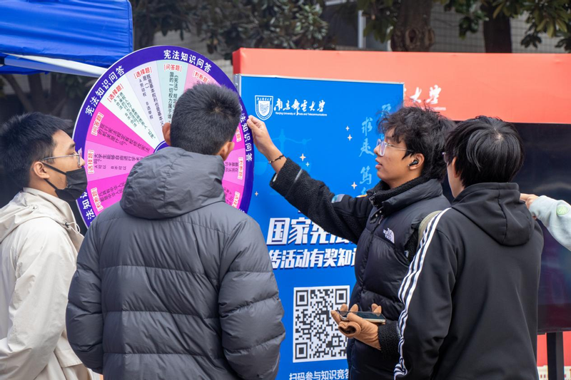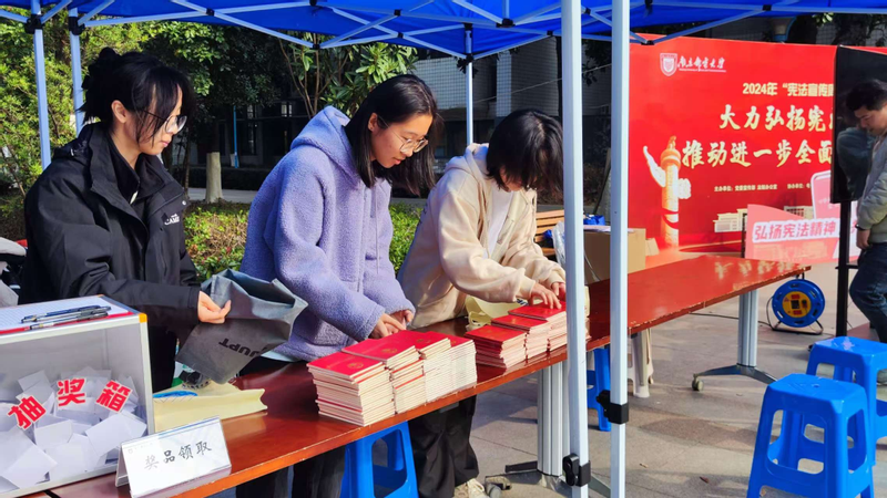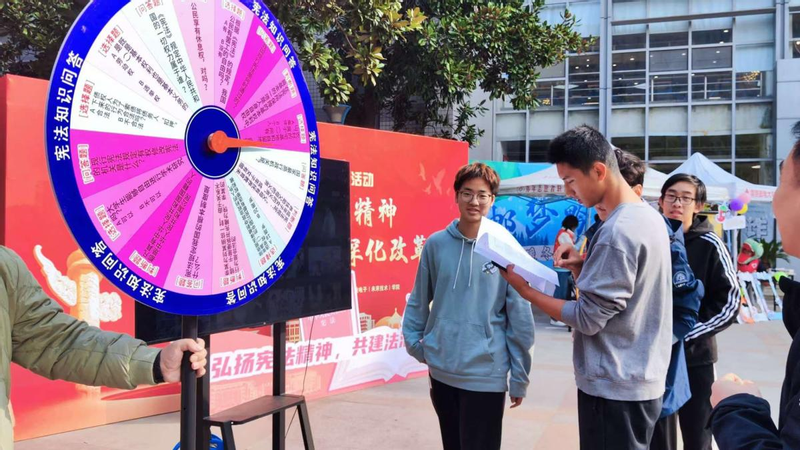 12月3日,由校党委宣传部、法制办公室联合主办,做爱视频 承办的“国家宪法日”主题活动在仙林校区南二食堂外场举行。活动现场,工作人员通过播放宪法宣传视频,展示与讲解宪法宣传展板,发放宪法宣传手册和普法书籍,提供公益法律咨询服务,开展“12.4宪法知识竞答”“宪法大转盘”游戏、“我与宪法合照”等方式,向过往师生普及宪法知识,为我校师生带来一场互动式、零距离的普法新体验。