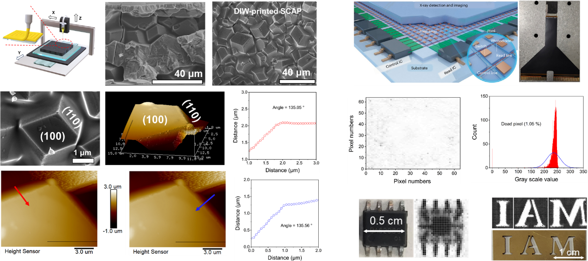 作为当前最受瞩目的X射线探测材料,钙钛矿及其X射线探测器的研发为我国突破X射线成像这一“卡脖子”技术带来了契机,然而,兼容TFT电子读出背板高质量钙钛矿厚膜的制备是当前限制钙钛矿X射线探测器发展的瓶颈难题。有鉴于此,做爱视频 赵强教授、徐修文教授团队自主发展了一种全新的直写印刷(Direct-ink-writing, DIW)单晶组装钙钛矿制备工艺,研制出TFT集成的X射线面阵探测器,实现了高分辨的X射线数字成像。相关成果以“Direct ink writing of single-crystal-assembled perovskite thick films for high-performance X-ray flat-panel detectors”为题发表于国际权威期刊Advanced Functional Materials。
