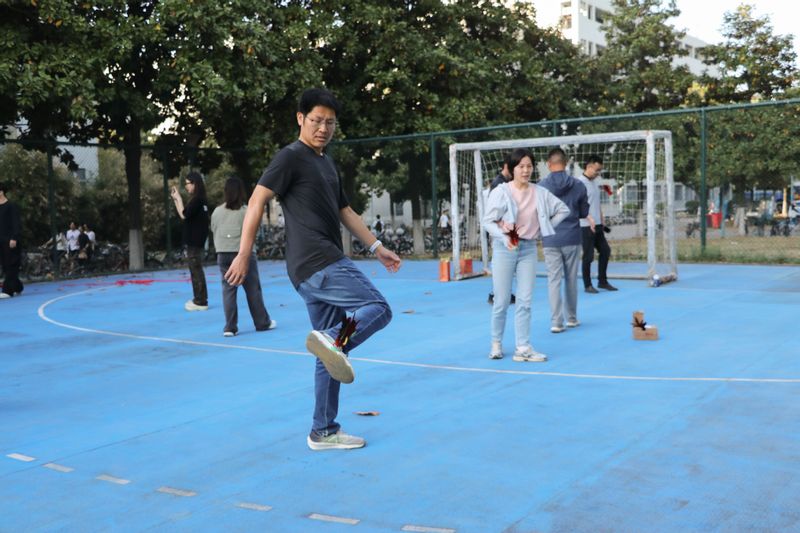 下午4时,运动会在欢声笑语中拉开帷幕。本次赛事精心设计了四项团体趣味项目,兼顾协作性、趣味性与竞技性。在“一圈到底” 项目中,10人一组手拉手传递呼啦圈,队员们灵活穿梭,默契配合,迅速完成接力;“鼓动人心”项目里,团队通过绳索协同控制鼓面,精准接弹空中皮球,此起彼伏的计数声将气氛推向高潮;“音乐传情”随音乐即兴传递道具,暂停时幸运者即兴表演,教职工们展示的歌舞才艺引发阵阵喝彩。最后的“踢毽子”个人技巧赛中,五彩毽球上下翻飞,展现了教职工们的敏捷身手。大家纷纷亮出自己的踢毽子绝活,展现了高超的技艺。