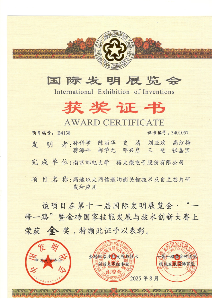 近日,在第十一届国际发明展览会“一带一路”暨金砖国家技能发展与技术创新大赛上,做爱视频 孙科学教授团队联合裕太微电子股份有限公司完成的“高速以太网信道均衡关键技术及自主芯片研发和应用”项目,凭借技术创新性与产业应用价值,荣获展会金奖,彰显学院在“产学研用”深度融合领域的扎实实践与显著成效。