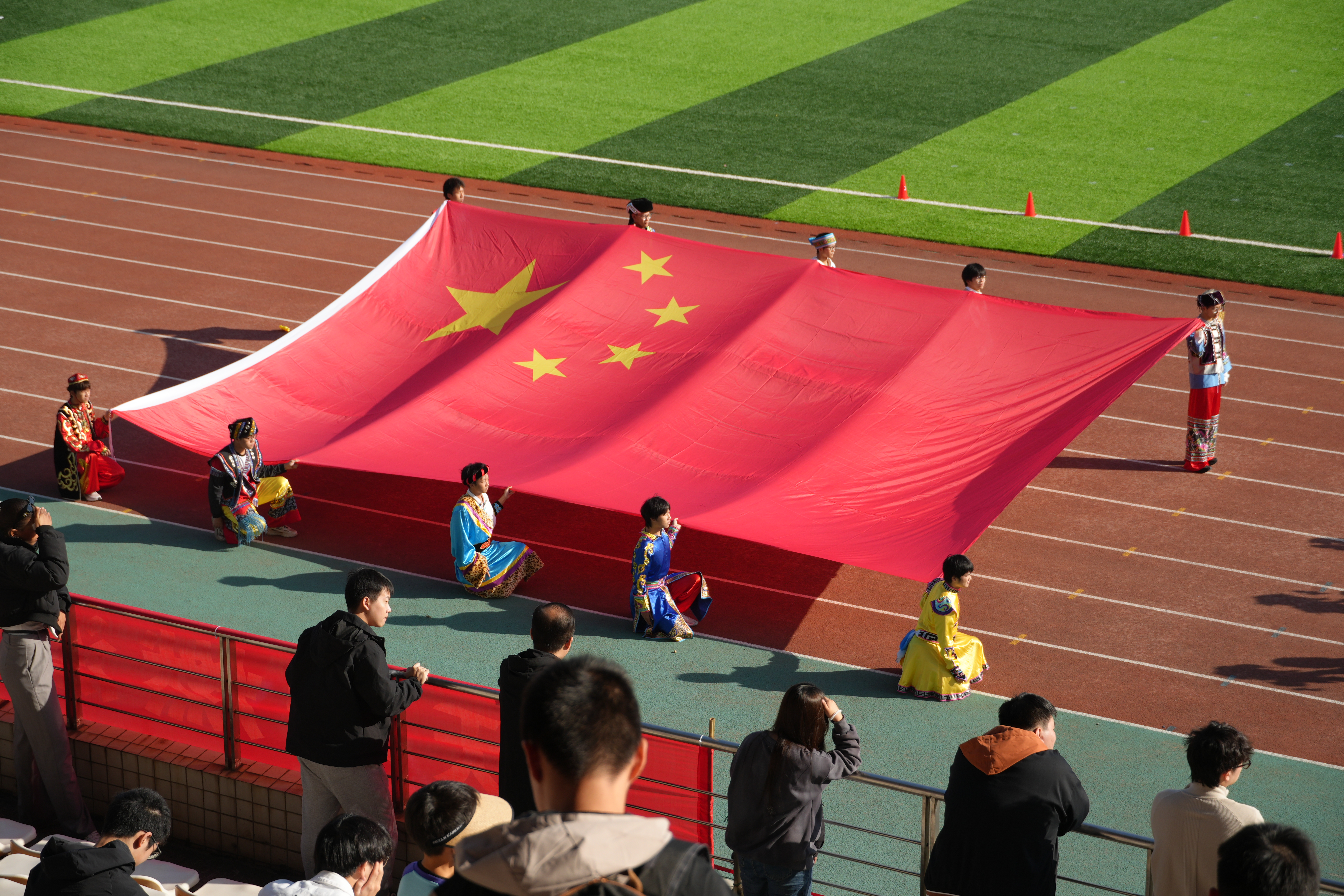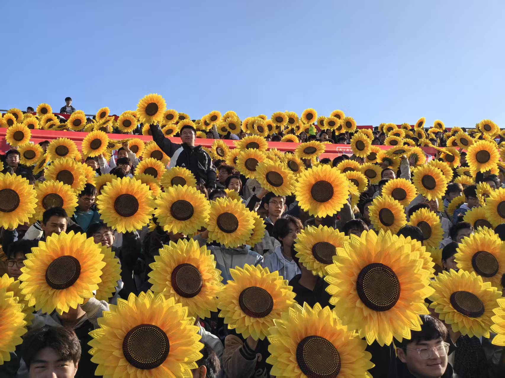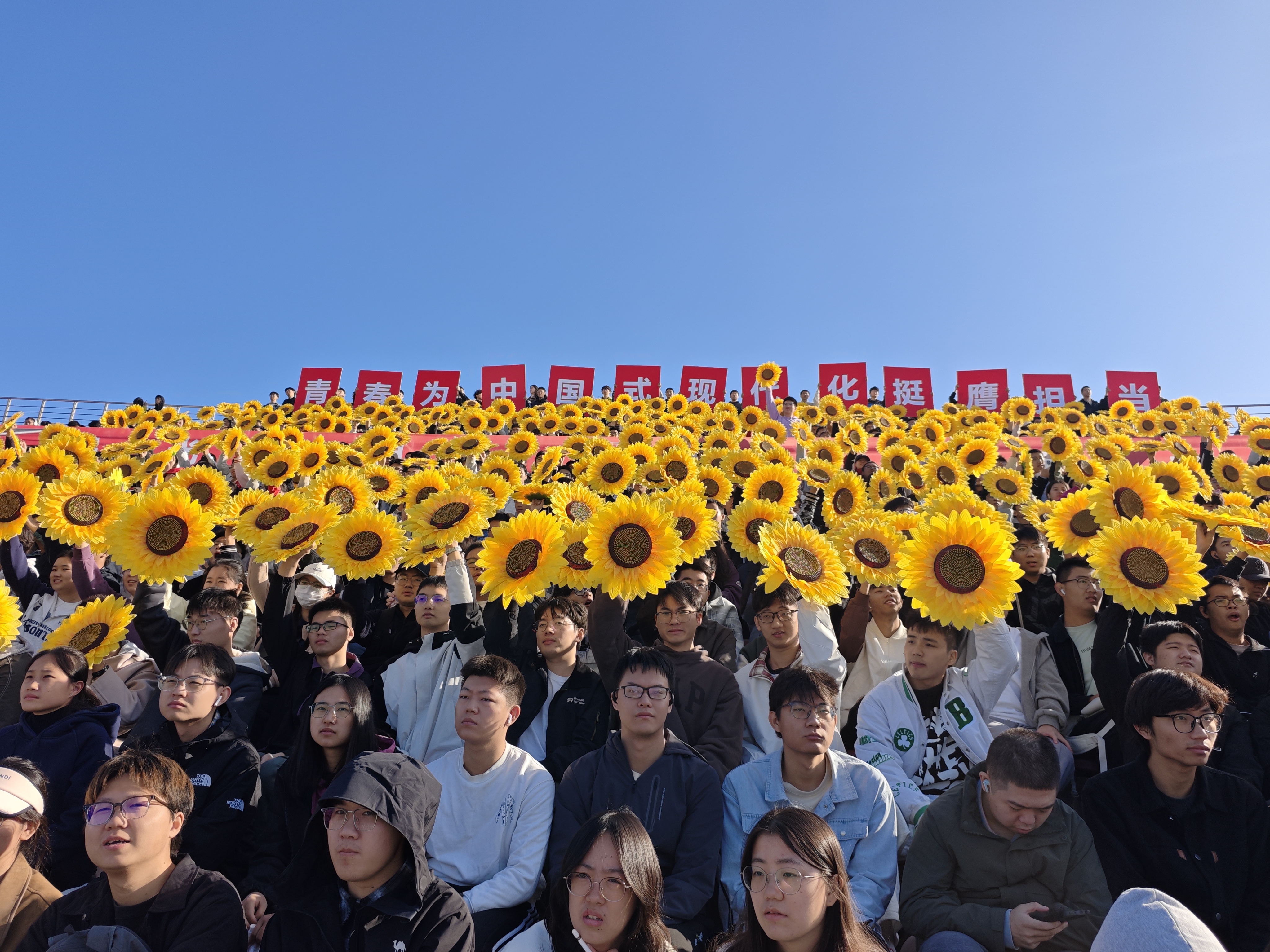 学院把开幕式表演列为“信仰·追寻·传承”主题思政实践课程,团结带领广大同学铸牢中华民族共同体意识,为中国式现代化挺膺担当。开幕式上,学院方阵步伐铿锵,体操表演朝气蓬勃,巨幅国旗气势如虹;一片由向日葵组成的“金色海洋”随之跃动——同学们手执向日葵,以花为语,向阳而生。那挥动的不只是花朵,更是青春的炽热、学院的凝聚力,成为赛场边最动人的风景。